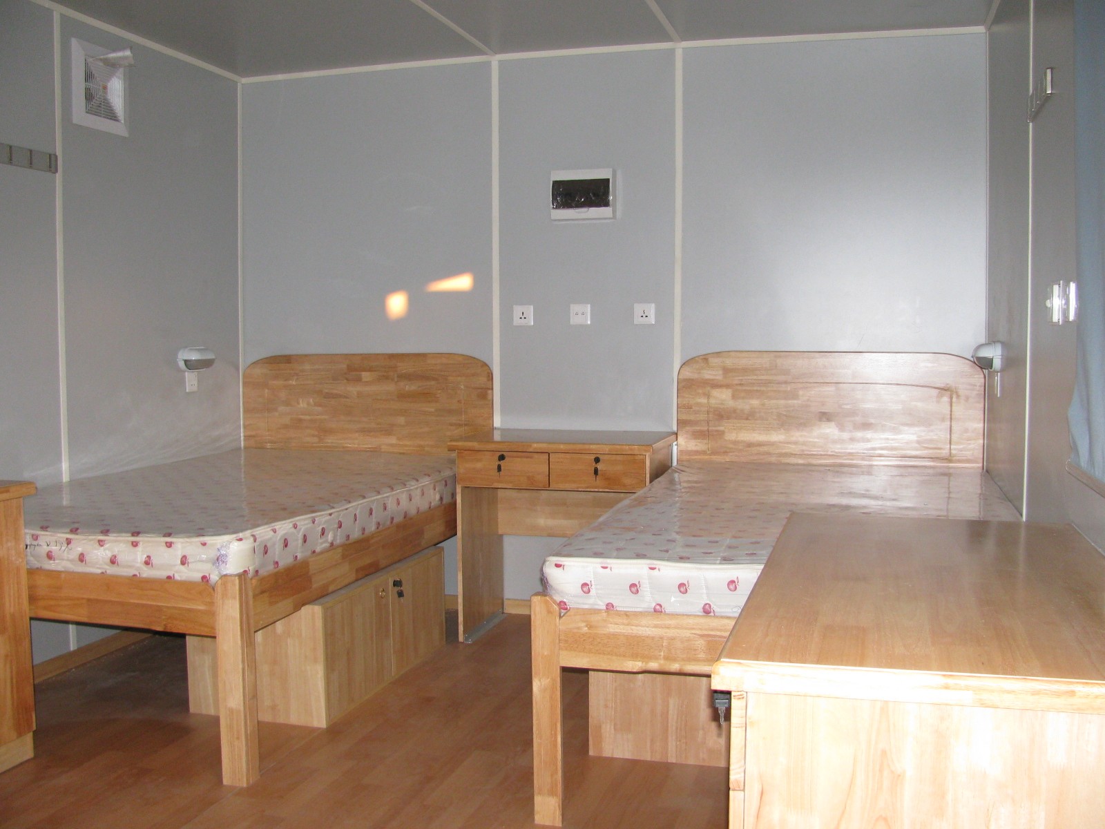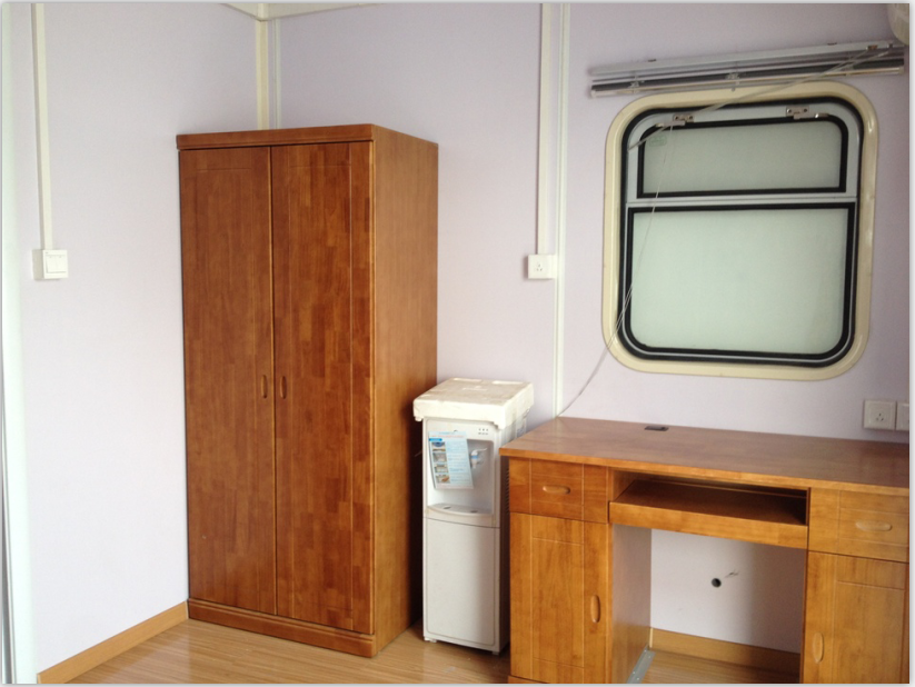 四人間基本配置:空調(diào),床,床墊,衣柜,衣掛,床燈,書架,桌子,椅子,熒光燈,列車窗,百葉窗簾,獨(dú)立衛(wèi)浴,淋浴隔斷,熱水器,洗手盆,面鏡,毛巾?xiàng)U,肥皂盒,衛(wèi)生紙盒等設(shè)施。